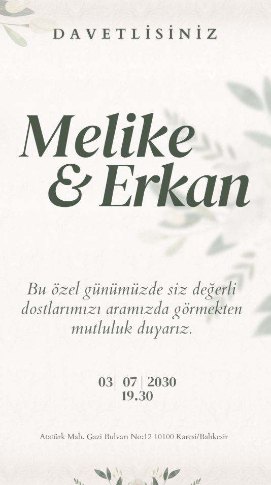 Davetiyenizdeki yazı alanları tamamen özelleştirilebilir. Dilediğiniz metin ve bilgileri bize iletebilirsiniz.