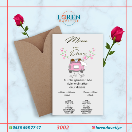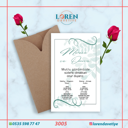 – Davetiye boyutu: 10 x 16 cm, 300 gr mat kuşe kâğıt